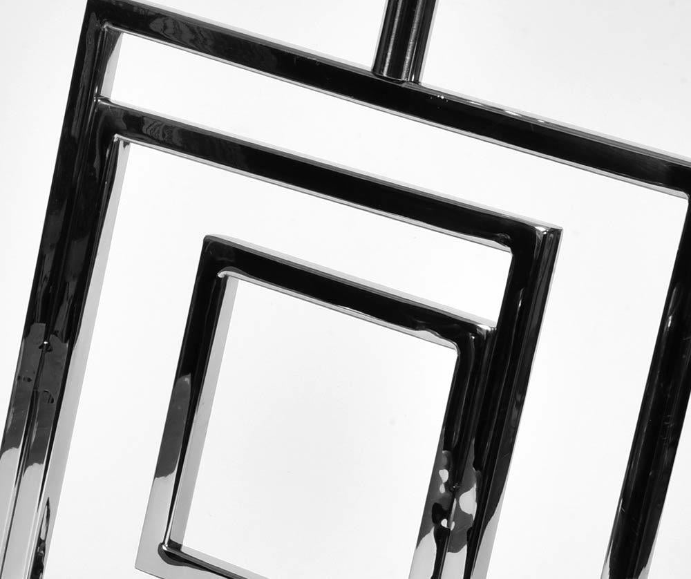 • Nowoczesna lampa stołowa – baza pod abażur z geometrycznym motywem – Lampa wyróżnia się oryginalną konstrukcją złożoną z metalowych ram w formie koncentrycznych kwadratów, tworząc nowoczesny i elegancki akcent dekoracyjny.