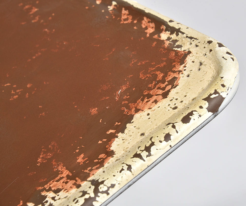 • Ręcznie postarzany metal – efekt mebla z historią – stolik metalowy vintage został ręcznie postarzany i kilkukrotnie malowany, dzięki czemu każdy egzemplarz jest unikatowy. Celowe przetarcia i niejednolita kolorystyka podkreślają rzemieślniczy charakter oraz nadają stolikowi prowansalskiemu autentyczny wygląd mebla z duszą.