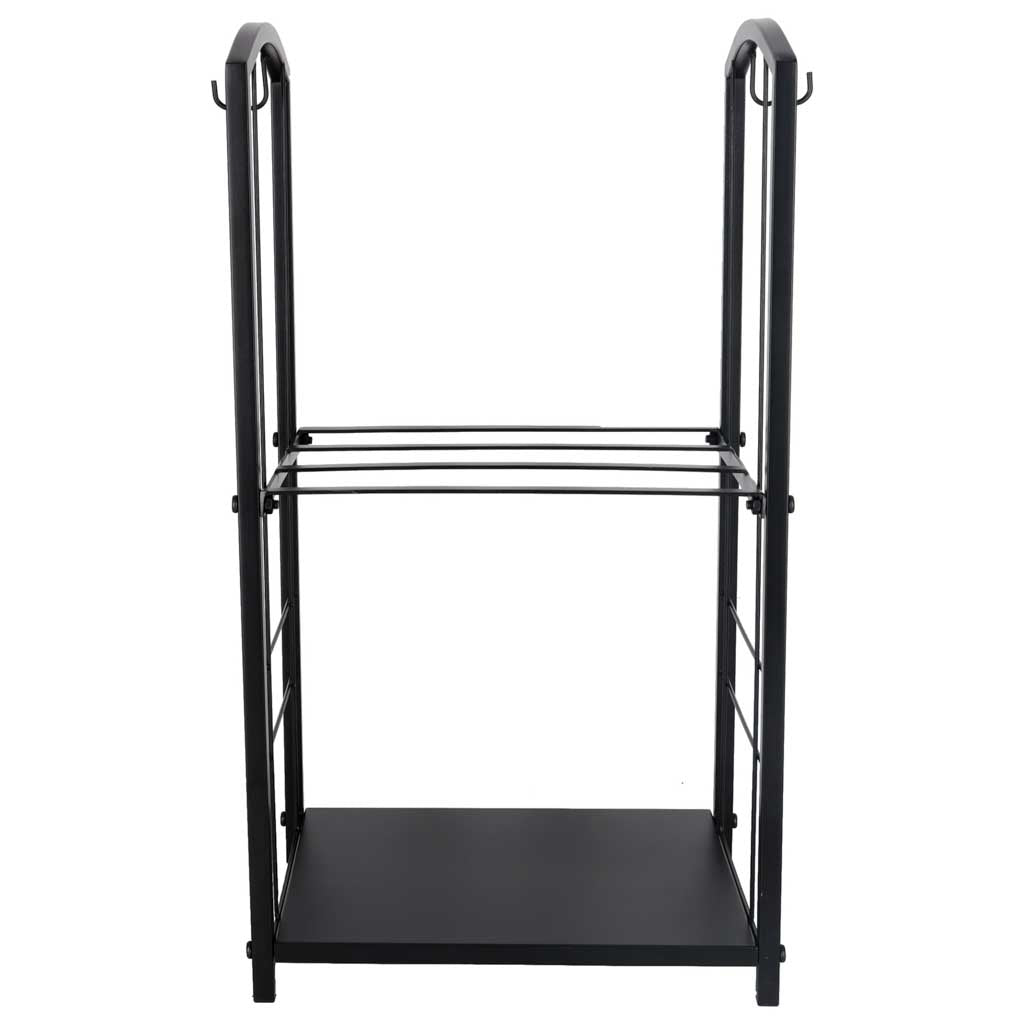 • Praktyczne półki ułatwiające organizację drewna – Stojak wyposażony jest w dwie półki – pełną i wentylowaną – które umożliwiają wygodne i estetyczne przechowywanie drewna opałowego. Takie rozwiązanie zapewnia dobrą cyrkulację powietrza, ułatwia dostęp do polan i pomaga utrzymać porządek przy kominku, bez konieczności częstego przenoszenia drewna.