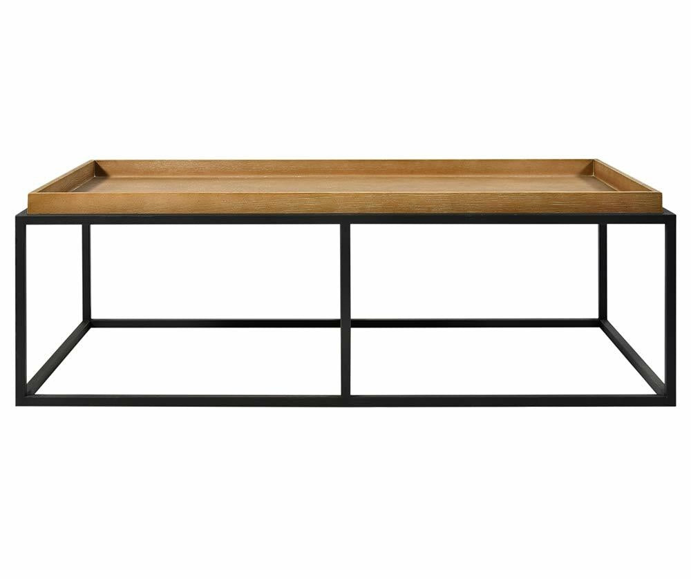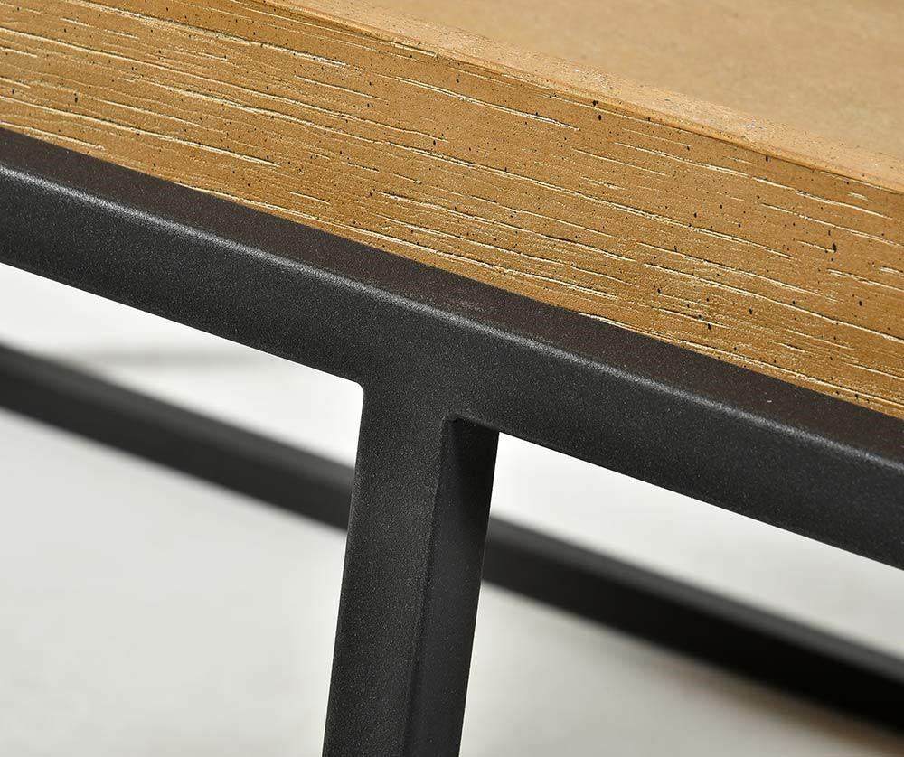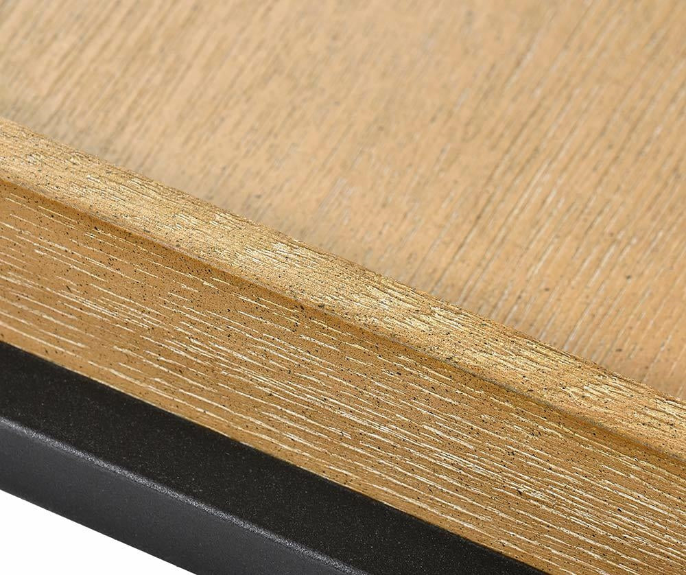 Jednym z najbardziej wyrazistych elementów tego modernistycznego stolika jest jego fornirowany blat, przypominający dużą drewnianą tacę z wysokimi rantami. Zastosowana drewniana okładzina dodaje ciepła i naturalności, doskonale kontrastując z czarną stalową konstrukcją. Całość prezentuje się niezwykle efektownie.