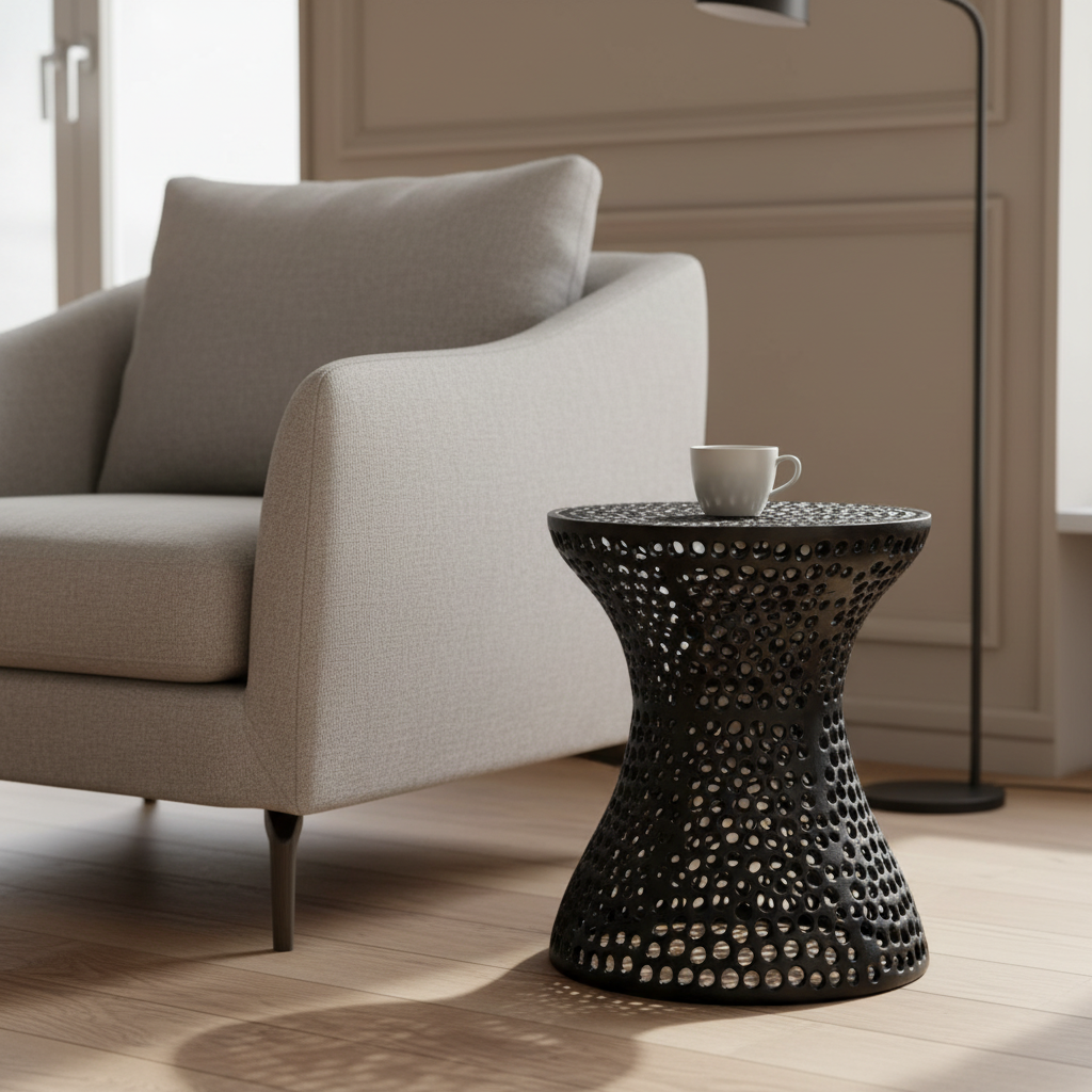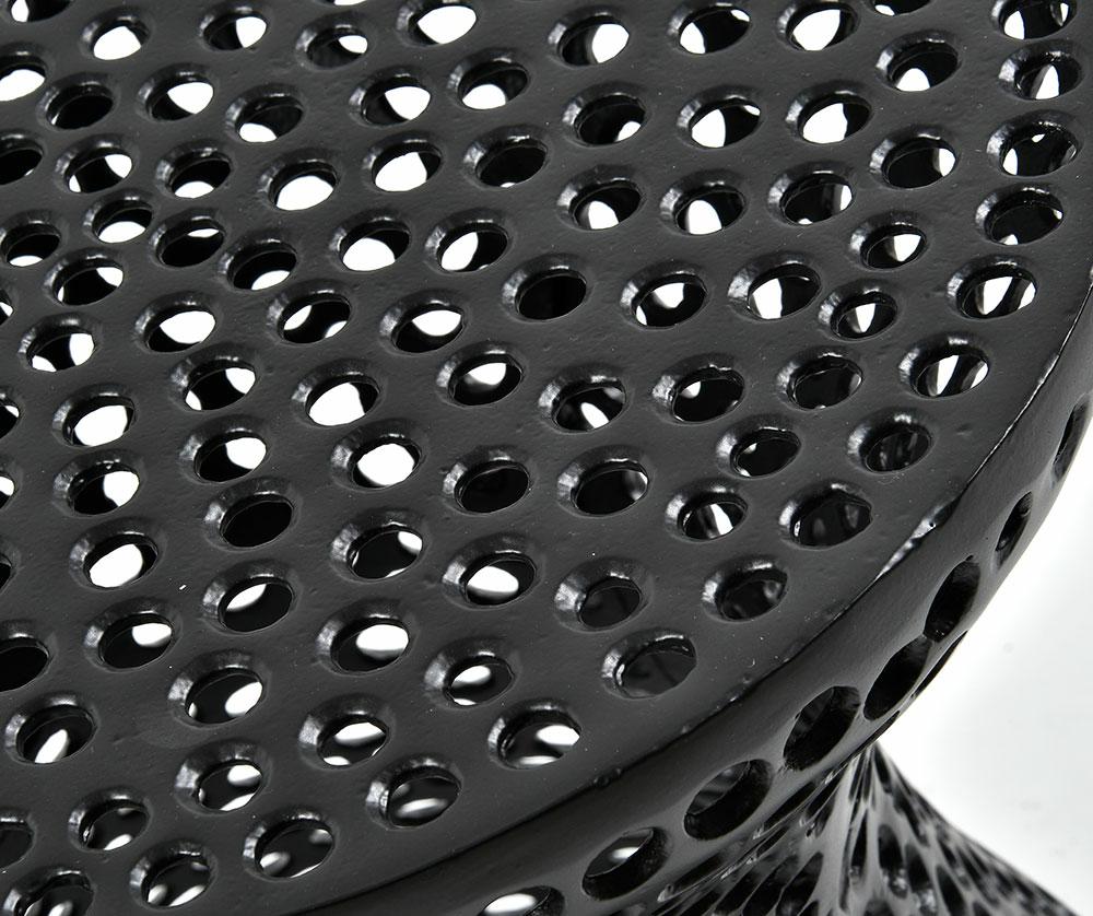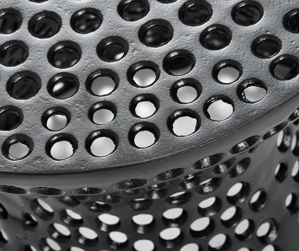 • Designerski metalowy stolik kawowy z ażurowym wzorem – stolik kawowy Nero wyróżnia się nowoczesnym, ażurowym wykończeniem w formie regularnych okręgów, które nadają mu lekkości i wyjątkowego charakteru. Ten ażurowy stolik metalowy stanowi dekoracyjny akcent w aranżacjach nowoczesnych, loftowych i industrialnych.