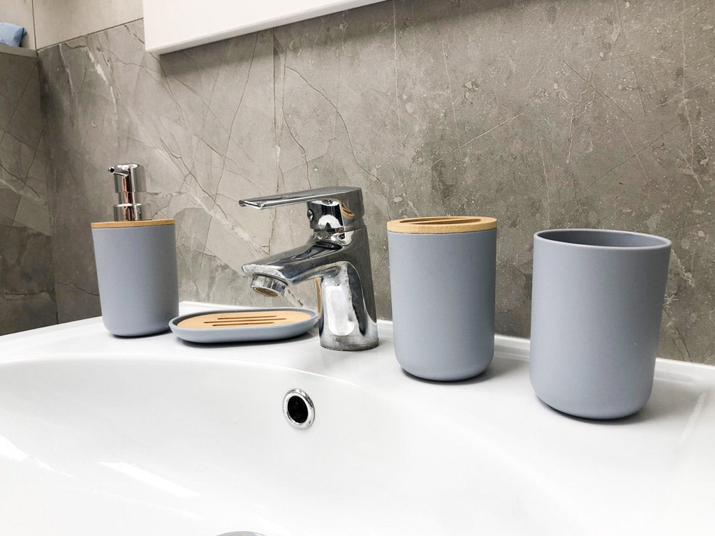 • Eleganckie drewniane detale podkreślające styl – Subtelne elementy drewniane nadają zestawowi naturalny i ciepły charakter, podnosząc walory wizualne akcesoriów łazienkowych. Dzięki temu zestaw pełni nie tylko funkcję użytkową, ale również dekoracyjną, wprowadzając do łazienki przytulny akcent.